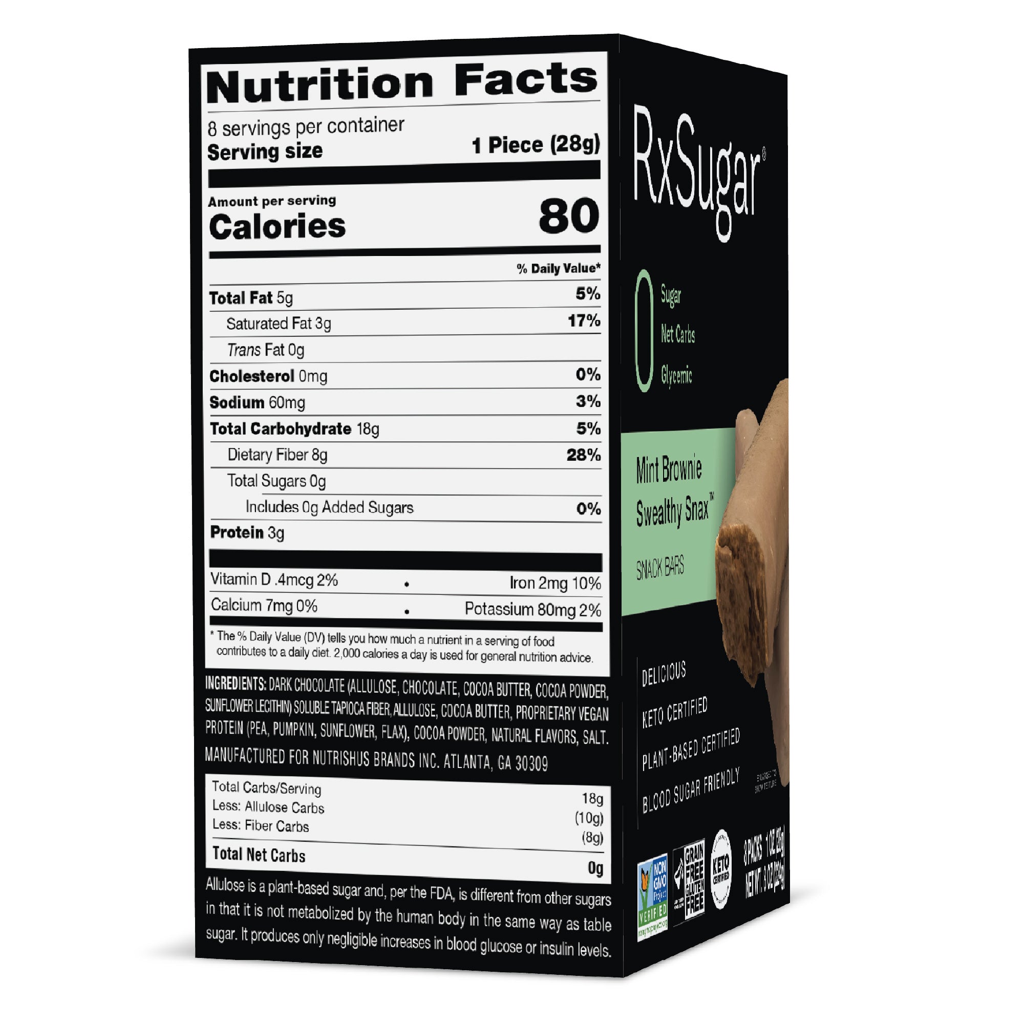 Certified Grain-Free/Gluten-Free, Keto Certified, FODMAP Friendly, and made with clean, plant-based ingredients—RxSugar® Swealthy Snax Candy Bars redefine indulgence with no compromises.